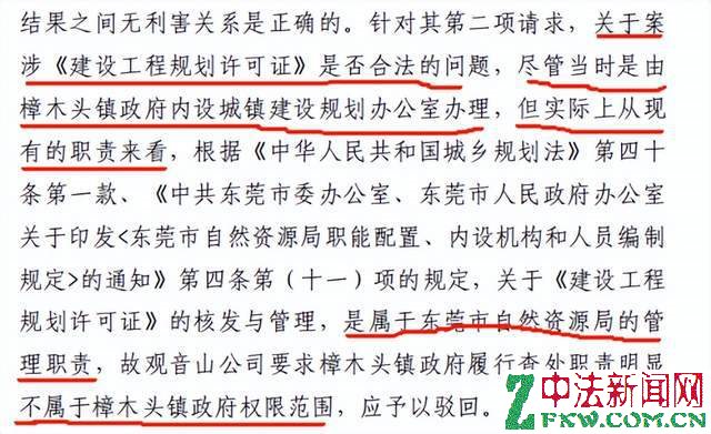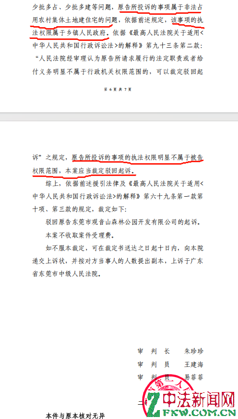 观音山两案联动:行政诉讼能否打破景区违建案僵局 广东观音山国家森林公园,地处东莞樟木头镇,总面积 657.18 公顷,森林覆盖率超 92% 。这里属亚热带季风性湿润气候,光热充足、雨量充沛,孕育了 1000 多种植物与 300 多种动物,国家保护动植物众多,堪称 “百粤秘境” 与 “天然氧吧”。公园承载着深厚文化,世界最大花岗岩石雕观音像矗立山顶,观音广场是重要文化活动举办地。多年来,它积极举办粤港万人相亲大会、万人登山大赛等近五十场大型活动,传承弘扬传统文化。尽管面临违建、违规电力设施建设等侵害,以及一些不合理行政对待,公园始终坚定维权,积极与不法分子作斗争。凭借坚韧不拔的努力,它为改善当地法治环境与营商环境树立了标杆,是极具担当的民营企业典范。 近日,东莞观音山与某政府的行政诉讼案件二审裁决落定,这一结果意义重大,为东莞观音山此前投诉的枉法裁判案带来新转机。两起案件看似独立,实则因观音山内两栋违建别墅而紧密相连,有着千丝万缕的关系。接下来,让我们一同回顾并深入分析这两宗案件的来龙去脉,探寻背后的真相与关联。 坐落在广东观音山国家森林公园内有两处别墅“颐雅山房”别墅和“名门”别墅,它们分别是香港人潘某燕及其四子女和港人余某及其老婆罗某兰名下的,别墅占用的土地所有权属于樟木头镇石新社区所有,潘某燕和余某通过花钱非法购买取得。然后此二家人通过隐瞒非法买卖农村集体土地的事实,编造相关材料,违法在东莞市国土局办理了《集体土地建设用地使用证》、在东莞市樟木头镇城镇建设规划办公室办理了《建设工程规划许可证》,其中其中潘某燕及其四个子女一家5口办理了5本土地使用证,余某、罗某兰夫妻办理了2本土地使用证。 潘宝燕别墅“颐雅山庄” 余兴别墅“名门” 两处别墅所在地块虽是山地,但也是林地,原本规划用途不是农村集体建设用地,在没有取得林业部门同意的情况下,东莞市国土局办理该两处别墅用地的《集体土地建设用地使用证》是违法的,东莞市樟木头镇城镇建设规划办公室办理该两处别墅的《建设工程规划许可证》也是违法的,此外,该两处别墅还存在少批多建问题等问题。针对上述种种违法行为,东莞观音山向东莞市自然资源局进行了举报,请求东莞市自然资源局对前述违法违规行为依法查处。然而,东莞市自然资源局答复称,投诉事项的执法权限不属于其权限范围,建议向樟木头镇政府反映。东莞市自然资源局的行为属于典型的推卸职责,“踢皮球”行为。 东莞观音山不服,提起行政诉讼,要求判决东莞市自然资源局依法履行职责。但是,东莞市第一法院的办案法官在明知潘某燕及其四个子女和余某、罗某兰夫妻的身份是“香港人”的情况下,在《行政裁定书》中,却故意隐瞒这些人的香港人身份,故意适用《土地管理法》第七十八条和《广东省人民政府关于农村村民非法占用土地建住宅行政执法权的公告》第一条的规定,认定不属于东莞市自然资源局的权限范围,进而作出了驳回东莞观音山起诉的裁定。《土地管理法》第七十八条和《广东省人民政府关于农村村民非法占用土地建住宅行政执法权的公告》第一条适用的前提是“农村村民”,“农村村民”是指具有农村集体经济组织成员身份的人员,潘某燕及其四子女、余某罗某夫妻的身份均是香港人,不具有不具有樟木头镇石新村民委员会集体经济组织成员身份,明显不属于“农村村民”,而且东莞观音山在起诉材料中明确多次指明他们是香港人,起诉书中他们的身份证信息也明确写明他们是香港特别行政区居民及其身份证号码,但是法官在审理过程中,故意隐含业主香港人的关键身份,这一身份在整个违法事实链条中至关重要,直接关系到土地买卖合法性等核心问题,同时,法官适用错误的法律,这一行为严重偏离了司法公正的轨道,使得违法者未受到应有的追究。(下图为诉东莞市自然资源局案的一审裁定书) 一审裁定结果出来后,东莞观音山始终认为,主审法官在办理东莞观音山公司诉东莞市自然资源局不作为一案中,故意违背事实和法律作出枉法裁判,情节严重,给东莞观音山造成重大经济损失,浪费国家司法资源,应当给予他们处分。 时间回到“东莞观音山在收到东莞市自然资源局的答复时”,当时,在吸取以往“政府部门相互踢皮球而导致投诉无门”的教训,东莞观音山按照答复的建议,以相同内容的材料向东莞市樟木头镇政府举报。但是东莞市樟木头镇政府并未对举报的违法事项进行查处,针对镇政府的不作为,东莞观音山向法院提起行政诉讼。东莞观音山诉樟木头镇政府一案,一审法院认为观音山公园不具备原告主体资格,裁定驳回起诉,东莞观音山不服提起上诉,二审法院认为,东莞观音山要求履职的内容有两项,一是查处潘某燕及其四个子女、余某和罗某兰夫妻非法买卖农村集体土地、采取欺骗手段骗取批准非法占用土地少批多占土地、少批多建楼房面积;二是查处樟木头镇城镇建设规划办公室为潘某燕及其四个子女、余某和罗某兰夫妻违法办理《建设工程规划许可证》的行为。针对第二项请求,关于案涉《建设工程规划许可证》是否合法的问题,尽管当时是由樟木头镇政府内设城镇建设规划办公室办理,但实际上从现有的职责来看,是属于东莞市自然资源局的管理职责。(下图是