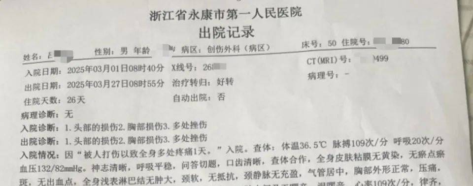 浙江金华一副镇长被指殴打村民,镇党委称仍在调查核实 近日,浙江金华永康市西溪镇村民吕先生向记者反映,他在咨询老房拆建事宜开车返程途中,遭到镇政府副镇长王雨果及身边工作人员的殴打,导致其头部面部等位置受伤,嘴部出血,为此住院26天。 涉事西溪镇副镇长王雨果拒绝了采访。4月18日,记者致电西溪镇党委书记俞晓雅,其表示有关情况正在进一步调查核实当中。 据吕先生讲述,2月28日上午9时许,在西溪镇某路段,他就老房拆建问题停车联系相关镇领导,西溪镇副镇长王雨果带领多人突然出现,强行将他拖下车并抢走手机和车钥匙,“连续打了我大概十几拳”。吕先生称,他随后被带上车,其间虽未再受到殴打,但人身自由受限。吕先生称,其借口“上厕所”,才得以逃脱。 因感到身体不适,吕先生当晚前往永康市第一人民医院就诊,并于3月1日一早办理住院手续,直至3月27日出院。出院记录显示,吕先生被诊断为头部损伤、胸部损伤和多处挫伤。 吕先生告诉记者,此次纠纷与老房拆建矛盾有关。2021年,他家重建房屋时因采光观景问题与邻居发生纠纷,邻居举报其房屋存在违章建筑行为,镇政府介入协调。在事件处理过程中,他又与镇政府工作人员产生了矛盾。直至2月28日,矛盾被激化。 吕先生称,事后他选择报警,但警方告知此事“归纪委管”,他又联系永康市纪委,纪委告知其受理结果将按照相关规定反馈。 记者致电涉事副镇长王雨果,其拒绝接受采访。吕先生向记者提供了一段其与西溪镇相关负责人的通话录音,对方称打人事件会有处理结果。3月10日,西溪镇人民政府就吕先生通过12345市长热线投诉的情况进行回复,称“工作人员的一切行为均符合工作程序”。 西溪镇纪委一名人士向记者表示,此事件仍在调查阶段,调查进度及证据不便透露,此前已多次与吕先生协商,后续结果将直接告知当事人。永康市纪委相关负责人告诉记者,针对吕先生反映的情况暂不作回应。 4月18日中午,记者多次致电西溪镇纪委书记应淑宝,截至发稿,未获接听。记者致电西溪镇党委书记俞晓雅,对方表示有关情况正在进一步调查核实当中。 |