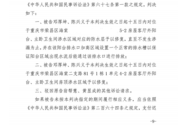 党员涉赌骂人、造假诬告竟胜诉!重庆荣昌案背后隐藏着多少保护伞? 作者∣邓爱华 摘要:原告(4-2业主)是一名党员,在家中当着执行法官等人的面,竟称自己打回牌都要输一两万,(点击观看早前文章:《重庆荣昌区一党员当执行员面竟称自己打回牌都要输一两万块钱》)并多次用方言辱骂被告(5-2业主)夫妇,还造假5-2主卧卫生间、客厅外阳台漏水证据诉至法院竟胜诉……持续十个月 4-2业主投诉5-2业主主卧卫生间、阳台漏水原因不明? 2024年5月19日,家住重庆荣昌区昌州街道板桥社区红日海棠静苑某栋4-2业主黄显成(下称“4-2黄显成”)向物业投诉,说家里主卧卫生间、客厅外阳台漏水,原因不明。 2023年7月13日,4-2黄显成的老婆翁帮慧通过业主群添加5-2业主陈兴义(下称“5-2陈兴义”)为好友,说5-2主卧卫生间水滴到头上。5-2陈兴义从网上买回一瓶堵漏王,在涂抹过程中不小心瓶子倒了,液体流入地漏被堵。 陈兴义带着防水工人到4-2翁帮慧家,因卫生间没有漏水,要求把被堵的管子更换,翁帮慧说如果不把上面卫生间地板砖全部打了做防水层就不许更换管子。防水工人称,他们前后去4-2家四次,一直不许更换管子。 2024年1月9日,4-2翁帮慧给5-2陈兴义发微信,说阳台顶上又在滴水,头天挂干的羽绒服,第二天穿上有的地方打湿了。 “你们阳台是鱼池?还是种了很多花?没有做防水吗?”4-2翁帮慧称:“我阳台边缘漆、落边砖都脱了,衣服、毛巾打湿了,不要漏水和滴水了。” 翁帮慧称:“楼上漏水很严重,天花板打湿已变色、有水,滴在我脸上、手上,墙周围都是湿的,可能你们地面防水有问题,上面的水才会漏下来。” 5月19日,4-2翁帮慧给5-2陈兴义发微信:“你们阳台又漏水,天花湿的地方还多,纸箱打湿了,我只能把那些没有干的衣服晾到室内,你上面整个阳台地面都要处理了。” 6月9日,翁帮慧发了一个视频,卫生间楼梯上很多水,地上湿了,问陈兴义漏水的事情好久处理? 5-2陈兴义称:“每次说漏水我们就下去看,卫生间和阳台顶部都是干的。”整整十个月!4-2黄显成称:“卫生间和阳台漏水原因不明!” 天花板拆下来后 现浇板焦干、表面涂料雪白,5-2业主仍被4-2业主起诉 6月24日,4-2业主和5-2业主在业主委员会郭主任见证下,由4-2业主组织工人对4-2阳台天花板进行拆除,以便查找漏水具体原因,并达成书面协议: ▲协议书。邓厚坤 提供