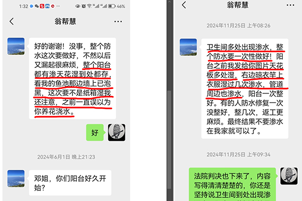 6月26日,天花板拆下来后,板子正面呈现多处湿的,背面纹路颜色深浅不一,干的,整个现浇板由涂料刮平,除5-2排水管下方4-2房顶交叉处及局部周围有渗水痕迹及漆面受损、剥落情况,整个阳台现浇板是焦干的,涂料雪白的。7月28日,4-2翁帮慧、黄显成一纸将5-2邓厚坤、陈兴义起诉到重庆市荣昌区人民法院(下称“荣昌法院”)并申请司法鉴定,要求解决阳台漏水问题,赔偿经济损失5000元,承担本案诉讼费。 淹没漏水区域 九小时后,物业保安检查是否漏水,4-2翁帮慧称已经擦过了? 为核实漏水具体情况,9月27日,主审法官钟明友等二人来到4-2翁帮慧家,经双方(5-2)协商一致,对5-2阳台可能漏水区域放水淹没,对主卫漏水区域放水淹没,请双方在下午七点查看具体情况,双方共同到场并拍摄检查顶面是否有渗水痕迹的视频(建议使用餐巾纸擦拭顶面的方式),逾期未到场将承担相应法律后果,双方也可以联系物业人员到场见证。 笔录显示,如果近五天内,4-2业主有发现漏水情况,也可按照以上方式由双方共同查看确认。4-2翁帮慧补充,主卫生间已有一年未使用,社区、街道已来现场多次查看,建议5-2管道周边做防水,洗手间马桶管道偶尔漏水,顶上有漏水痕迹。上午10时02分先后对5-2阳台和卫生间进行放水,晚上8时03分,物业刘保安到4-2阳台喊翁帮慧拿巾纸来擦拭,翁帮慧称已经擦过了。“阳台都是干的”,刘师傅说:“卫生间都是焦干的。” 物业管理人员 包括4-2翁帮慧在内,任何人拿不出来阳台漏水的证据 荣昌区昌州街道板桥社区居民委员会党委副书记、综治专干唐顺利称:“我们前前后后去了五六次,我们是这么讲的,我们也不是专业的,跟五楼、四楼都说了,正常情况,只要楼上漏水下来都是楼上的责任,我们去四楼看,只有漏水的痕迹,最先以我个人的主观意见是,五楼洗衣机旁管子水流不赢满出来了就会浸下去,当时天花板还没有拆的时候,通过我们的工作经验,说五楼的下面管子周围的或是防水没有做好,年生久了。” 唐书记还称:“我们没有注水看,只有一次,看到阳台管子下方地面一层纸上有一滴水,天花板上有‘水雾’,管子周围有渗水痕迹,是干的,老印子,不晓得是哪个时时候的......我们不懂,都不是专业的。” 昌州街道分管物业付主任称:“我们当时没有确定是不是漏水。” 重庆佳众物业管理有限公司卢某某称:“我们都跑了十几次,一讲漏水我们就跑去看,社区来了好多次、街道来了两次,每次我们都在,以前是天天找到我们费,要我们物业找律师起诉,又要街道请律师起诉,司法所来了给她说了,这跟物业没有半毛钱关系,她才不找我们的。每次去我们用手去摸,是干的,你(翁帮慧)说摸不到,我们拿纸巾去擦,拆吊顶时我还通知业委会郭主任、网格员、保安来一起拆的吊顶,看了全是干的。” “她原来是哪个单位退休的?”卢某某称:“听说这个女的是哪个单位的教师。” 卢某某还称:“漏水起眼都看得出来,是湿的,痕迹可能是曾经漏过水或者返销造成的,我们鉴定不出来,她也鉴定不出来,毕竟十几二十年的房子,包括物业、社区、街道、你们(邓厚坤)、她自己(翁帮慧)都拿不出任何一个证据讲打湿了水。 ” 九小时不漏水 4-2翁帮慧称纸巾是湿的,叫老公不要再说,他在乱录像! 9月27日,法官目睹5-2阳台和卫生间放水九小时后5-2业主和物业刘保安到4-2家阳台。刘保安喊拿张纸来,翁帮慧称:“已经擦过了!” “哪个擦过的?”翁帮慧还称:“我已经跟你说了,上面有水才能擦,没有水你擦有啥用?如果水都渗到那个位置了,你,你们下回都不要来了。” 10月9日,4-2翁帮慧又说她阳台、卫生间渗水。5-2邓厚坤等人去4-2阳台,没有看见渗水的情况,即要求察看卫生间。翁帮慧的丈夫黄显成称:“哪里有渗?没都没有,看不到,卫生间看不到了。” 翁帮慧打断黄显成的话,称:“你不要再说!他在乱录像!” 翁帮慧还称:“在你们来之前,物业人员和网格员也来看了,都说在渗水。” 物业卢某某证实:“我和网格员刚刚去看了,还拍了照片,没有感觉到有湿的。” 虽不存在明显漏水、但存在渗水情况! 修复5-2渗水区域防水层(设置排水槽)、4-2房顶渗水区域 法院认为:4-2房屋客厅外阳台、主卧卫生间虽然不存在明显漏水,但存在渗水情况,并已造成房屋对应区域漆面和抹灰面受损,影响到4-2相应区域的正常使用,5-2业主作为管理人、使用人,已构成侵权,应承担相应的民事责任。4-2业主要求5-2业主对5-2客厅外阳台、主卧卫生间渗水区域对应的防水层予以修复直至不发生渗漏为止,并将4-2客厅外阳台、主卧卫生间因渗水导致受损的区域予以修复,符合法律规定,予以支持;对4-2主张的赔偿经济损失5000元的请求不予支持。 对4-2业主要求5-2业主对5-2阳台做檐口、外挡水的诉讼请求,法院认为房屋本身无檐口、外挡水,也未举证证明5-2业主有改变阳台整体的平面状况,应承担举证不能的法律后果。 同时,因5-2业主在阳台排水口区域加高了3厘米左右以方便防止洗衣机,该行为将改变阳台平面的排水状态,并可能改变该区域出现水流后的排水状态(即可能出现水流直接外溢),应予以整改,结合日常生活经验及4-2业主意见,法院对4-2业主的该诉讼请求支持为在排水口加高区域设置一个正常的排水槽,以保证阳台区域出现水流后能通过该排水口进行排放。 判决:一是5-2邓厚坤、陈兴义于判决生效之日起十五日内对5-2阳台和卫生间渗水区域
