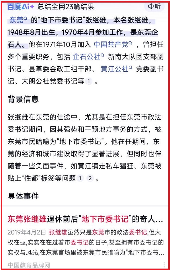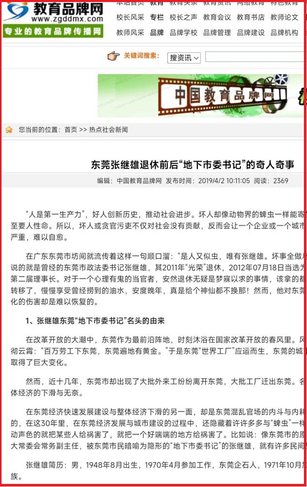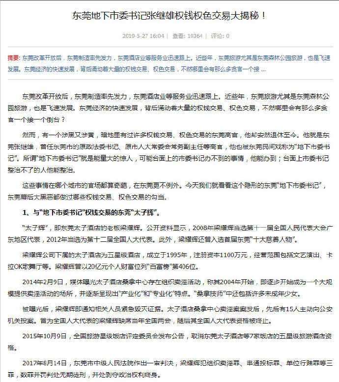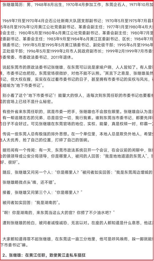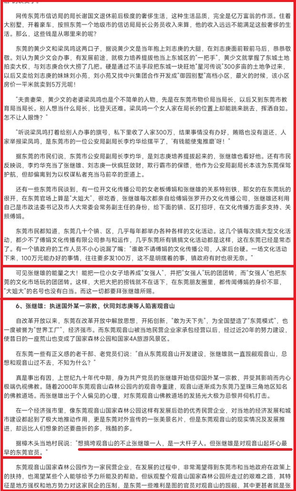 | 东莞市多位前领导落网,网曝众多问题的地下书记能否置身事外? 文 郑义 东莞市是改革开放前沿城市,从1988年由县升级为一个不设县只有镇的地级市。不少市领导为她的发展殚精竭虑,做出了突出的贡献,东莞老百姓是看在眼里,记在心里,比如李近维和佟星二位书记,笔者在网络上看到网页评价很高。 然而从刘志庚担任市长乃至市委书记后,东莞的政治生态和自然环境均遭到了破坏,不少市领导也被查入狱。 ![]() 东莞市历任9位市委书记5任市长就有三位书记、二位市长被查:首任书记欧阳德因受贿被判刑。 刘志庚在2004年-2006年担任市长后担任市委书记至2011年,后任广东省副省长,于2017年被判无期徒刑。 徐建华在2011年至2016年担任东莞市委书记,并在同期担任市人大常委会主任。他在卸任后7年被查。 李毓全:东莞市原市委副书记、市长。李毓全在2006年任东莞市市长,2012年任东莞市政协主席,2016年卸任,2024年8月被查。 而被查的东莞市级领导就多了:东莞市委原常委、市纪委原书记甄瑞潮在2017年6月退休,2019年11月受到党内严重警告处分,降低退休待遇至二级巡视员,2024年1月被查。广东省发展改革委副主任、省能源局局长的吴道闻曾在2004年至2014年担任过10年的东莞市副市长,2024年11月15日被查。 东莞市政协原党组副书记、副主席钟淦泉,因严重违纪违法被开除党籍;东莞市人大常委会原副主任方灿芬,因严重违纪违法被开除党籍和公职;东莞市政协副主席罗晓勤,因涉嫌严重违纪违法接受审查;东莞市政协原副主席何绍田,因涉嫌严重违纪违法被开除党籍;东莞市人大常委会副主任罗军文,主动投案并接受调查后被双开;东莞市人大常委会原党组成员黄庆辉被查;东莞市政府党组成员、秘书长的邓涛被查;东莞市政协原副主席邝明子被查;东莞市原正厅级干部李汝求被查;东莞市人大常委会原党组成员、副主任梁荣业被查;东莞市监委原委员王居乐被查;市纪委原副书记、市监委原副主任曾广华被查;市纪委副书记、监委副主任李东华被双开。 除此之外,东莞市各部门级乡镇领导人被查的就更多了...... ![]() 刘志庚被查的消息出来,位于东莞市樟木头镇的广东观音山国家森林公园挂出了横幅表达欢心:作恶的,必将被老百姓唾弃! 有网文曝光刘志庚2004年2月到东莞任职,追随他的利益集团就迅速布局,刘志庚整个家族好像蝗虫一样都到东莞做生意形同抢钱,所向披靡。2004年7月市长刘志庚到樟木头镇考察,镇委镇政府领导班子全程陪同并在观音山公园前后上下都转了一圈,他就有了将观音山公园收入家族囊中,将观音山公园毁林5000亩而开发房地产的胆大妄为的构思:如将这一大片森林开发房地产,保守算也可创造超千亿的利润。之后东莞市林业局和樟木头镇领导已接到刘志庚家族准备要拿下观音山公园做房地产的暗示。 2006年初6月,樟木头镇常务副镇长罗伟伦把黄淦波叫到办公室说:镇政府决定以3000万收购观音山,用一间约1万平方米的旧厂房抵价,其实际价值不到1500万元。观音山彼时投资已上亿了,黄淦波董事长当即拒绝。而在2009年时任樟木头镇委书记的李满堂也把黄淦波叫到办公室说刘志庚一个亿购买,已投资7亿的黄总依旧拒绝。 得罪刘志庚利益集团之后,观音山遭到了东莞市几乎所有部门的刁难及迫害,被称为东莞市地下市委书记的张某雄在其中出谋划策,甚是积极,给观音山公园造成了多达20余个磨难…… ![]() 2017年5月31日,南宁铁路运输中级法院公开宣判广东省人民政府原副省长刘志庚受贿一案,对被告人刘志庚以受贿罪判处无期徒刑,剥夺政治权利终身,并处没收个人全部财产;受贿所得财物予以追缴,上缴国库。收购打手之一罗伟伦也于2024年4月涉嫌贪污受贿、被开除党籍并取消退休待遇。 值得一提的是,网络多次曝光存在不少问题的地下书记张某雄在2011年退休,至今安然无恙。 众多官员被查,观音山至今依旧被迫害,有人指出:地下书记及利益集团依旧在搅动风云,左右着东莞市! 张某雄师父要在观音山设坛号令天下未果 极力打压观音山 不少网络曝光了张某雄的巫师师父在其介绍下找到观音山公园掌舵人要设坛被拒的事情,这可是严重的政治问题呀。 网文 《记者访谈实录:观音山国家森林公园董事长黄淦波谈观音山存在的部分问题及背后原因》里详细介绍了此事。2003年五六月份吧,当时东莞市政法委书记张继雄带着五六个人来观音山视察工作,开车上山走到一半的时候,他们车子都停了,大家步行上山,走到前面的是政法委书记张继雄,他说黄老板你所有的情况我都知道,你今后有困难找我。然后让他的秘书把他的名片交给我。张继雄他们一行人到山顶看完观音山之后就走了。临走的时候张继雄指着旁边的一个年轻人说,这个是我的朋友,过几天会找你,有事多合作,观音山的事情他来搞定。于是我就跟那个人交换电话了。 过了两天,那个人就打电话给我约我见面,见面后他说黄老板你是个聪明人,你知道我找你什么事?我说不知道。 他淡淡一笑说,我明确的告诉您,我不是政法委的人,也不是官场上的人,我别的本领没有,就是能呼风唤雨、移山倒海、调派天兵天将,号令天下,张继雄等人也是我的徒弟,这就是我的本领。 我说那么神吗?他说要不要试一把?于是他就讲述我昨天晚上睡觉前想什么以及这两天在想什么会干什么。他说的确实很对。我说你是归佛教还