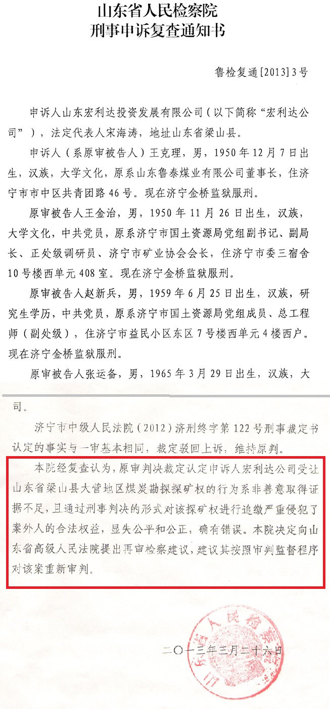 天大的冤案,宏利达公司及王克理随即到山东省人民检察院、山东省高级人民法院进行申诉。省检察院非常重视,认真复查了兖州市人民法院(2012)兖刑初字第51号刑事判决书、济宁市中级人民法院济刑终字第122号刑事裁定书和涉案的事实依据,下达了鲁检复通【2013】3号刑事申诉复查通知书,通知书载明:本院经复查认为,原审判决裁定认定申诉人宏利达公司受让山东省梁山县大营地区煤炭勘探探矿权的行为系非善意取得证据不足,且通过刑事判决的形式对该探矿权进行追缴严重侵犯了案外人的合法权益,显失公平和公正,确有错误。本院决定向山东省高级人民法院提出再审检察建议,建议其按照审判监督程序对该案重新审判。