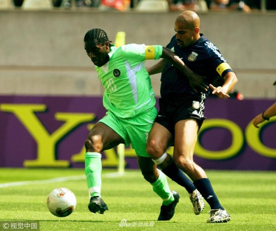 2002年6月2日,韩国釜山,2002韩日世界杯小组赛,阿根廷Vs尼日利亚。 上半时尼日利亚球员阿德波尤的一脚倒钩。