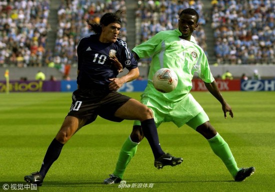 2002年6月2日,韩国釜山,2002韩日世界杯小组赛,阿根廷Vs尼日利亚。贝隆带球。