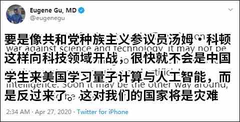 他一边抹黑中国“释放病毒”,一边又空口无凭地指责中国“想赶在全世界前面率先找到疫苗、作为筹码”。此外,科顿还认为中国赴美留学生只能选文科,比如“学习莎士比亚的著作和《联邦党人文集》,而不是量子计算与人工智能。”
