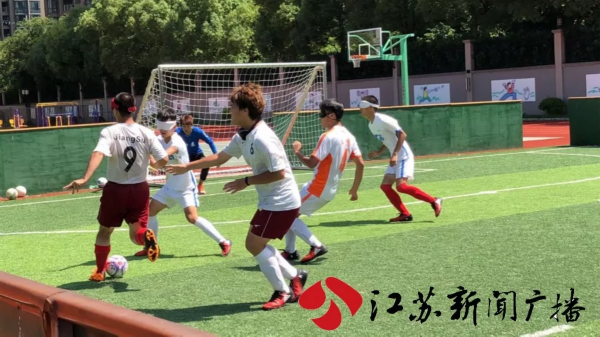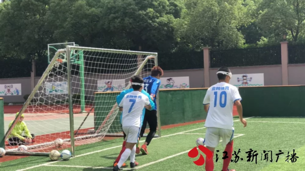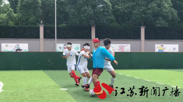 盲人足球 “喂!喂!喂!用力!再用力!打门!” 6月23日清晨,在南通特殊教育中心的足球场上,江苏盲人足球队的队员们正在踢一场训练赛,运动员们带着眼罩,一边不断发出声音向其他队员传递自己的方位,同时两腿不断盘带,把球往前踢,身手灵活,对抗程度丝毫不输常人。 很难想象,他们踢球时,眼前只有一片黑暗。江苏盲人足球队特教成雪枫:“我们盲人分3级,B1、B2、B3,我们参加盲人足球的,必须要求是B1,必须完全无视力。守门员是正常人,眼睛看得见。其他的,就是有微弱视力,我们比赛的时候也要把眼睛全部蒙实,所以说所有人基本上是无视力在比赛。”