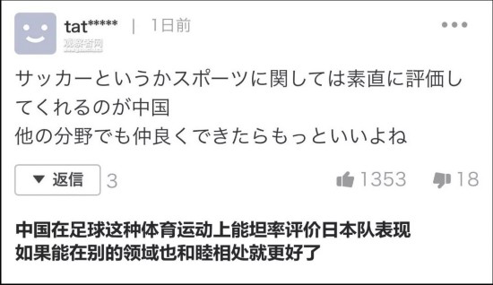 那篇球评中有这么一段话: 面对实力、名气皆不如自己的日本队,在顿河上航行的“巨型航母”比利时队几乎翻船,卢卡库们的世界杯之梦差一点就被埋葬在罗斯托夫体育场。 报道还提及,新华社其他多篇评论如实反映了日本队这4年中的进步。 报道最后还引用了一位不具名的中国网友的话: 我多少有点理解日本文化中总是宣扬的“魂”是什么了……日本队堪称“亚洲之光”。我们也应该尽快找到属于我们自己的“魂”。 对于中国球迷的肯定,日本网友也不吝赞美之词。本次选择的评论都是点赞数前15中的评论,大部分人都对中国球迷慷慨赞赏日本队表示感谢。