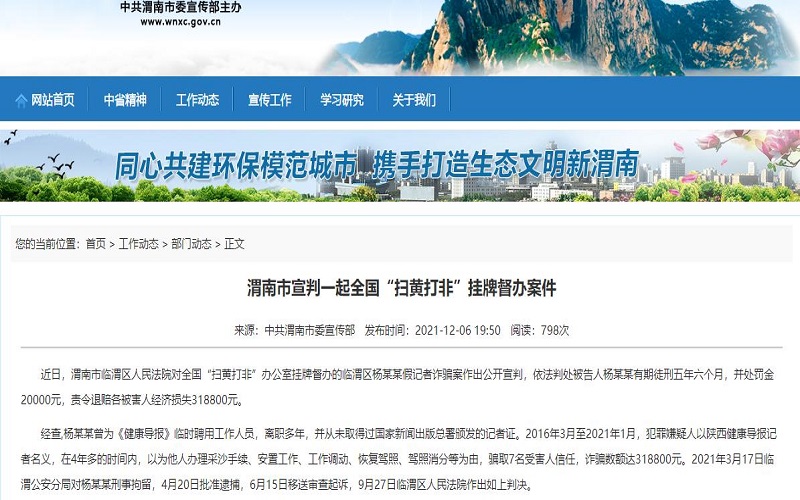 近日,渭南市临渭区人民法院对全国“扫黄打非”办公室挂牌督办的临渭区杨某某假记者诈骗案作出公开宣判,依法判处被告人杨某某有期徒刑五年六个月,并处罚金20000元,责令退赔各被害人经济损失318800元。 经查,杨某某曾为《健康导报》临时聘用工作人员,离职多年,并从未取得过国家新闻出版总署颁发的记者证。2016年3月至2021年1月,犯罪嫌疑人以陕西健康导报记者名义,在4年多的时间内,以为他人办理采沙手续、安置工作、工作调动、恢复驾照、驾照消分等为由,骗取7名受害人信任,诈骗数额达318800元。