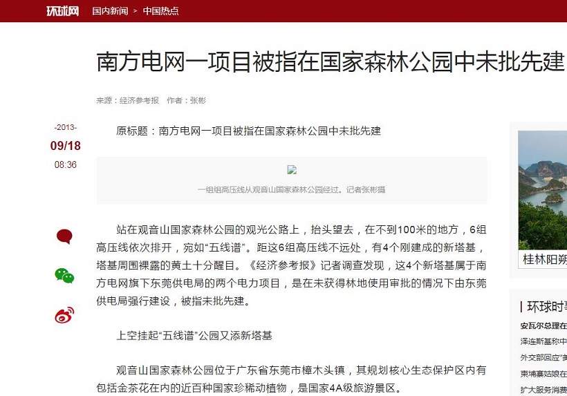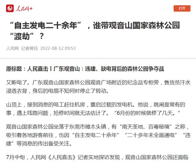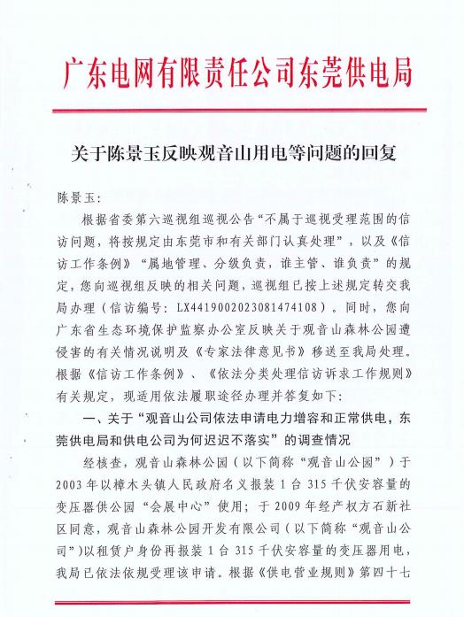 | 南方电网孟振平董事长:您知道拒绝给公园供电阻碍了民营企业的发展吗?! 独立撰稿人 李海波 位于东莞市樟木头镇的广东观音山国家森林公园是全国首家民营国家森林公园,不仅在全国乃至国际上影响不小,而且对东莞的经济社会发展等方面的贡献也不小:公司年交税收千万元左右(如果不是当地有关部门在观音山2010年成为国家4A级旅游风景区后,门票还是按照当地政府强行的指导价实行2006年的45元至今不予调价的话,观音山年交税收会更多!)、其创新经营模式为服务城市生态环境高质量发展体现了民企担当、为东莞当地社会的经济发展、文明提升、文化繁荣、社会和谐等方面做出了巨大的贡献:景区直接带动300多位员工就业,带动当地数十个行业的发展,间接带动上千人就业和上万人改善生活...... 然而令人心酸的是,观音山发展却是异常艰难,从黄淦波1999年接手石新村烂尾的无名荒山开始打造观音山时就遭受到了东莞市主要官员因抢夺观音山公园经营权和财产不成而引发的村、镇、市里多部门的长期刁难打压,南方电网也在其中,公园至今仍有超过80%的区域无法获得正常供电。 ![]() 追溯南方电网不给观音山公园供电的网络曝光,近年来的网页多达数百篇,《观音山公司诉南方电网等侵权案在广东开庭》、《东莞维权有多难?供电部门22年不给民企观音山供电》、《东莞市电力部门长期拒绝给观音山国家森林公园供电何解》、《广东观音山国家森林公园依法申请用电 东莞供电局长期拒绝供电并企图推卸责任》、《“小香港”之称的繁荣地,存在未通市政电力之现象》、《广东观音山国家森林公园多年缺电频遭毁林的背后》、《首座民营国家级森林公园遇通电难题 欲借纾困潮破局》、《“电老虎”现形记:东莞国家级景区供电被卡脖子23年》、《自主供电23年 广东观音山国家森林公园何时全面通电》、《东莞民企艰难发展之路:在那些没电的日子里》、《国家森林公园遭遇“电老虎” 24年用电问题悬而未决》、《东莞民企给供电局送“锦旗”,希望解决公园80%服务区域用电》、《给国家森林公园供电 点亮东莞民企发展的希望》、《广东观音山如何从黑夜走向万家灯火》、《25年经营权争夺余波:观音山国家森林公园遭电力部门“卡脖》、《25年黑灯瞎火,东莞民企送锦旗只为能见“光明”》、《豪横的南方电网就是牛!不在乎给不给观音山供电?!》、《南方电网为何不给广东观音山国家森林公园供电》、《公园要求用电可以吗?专家:不能拒绝供电》、《东莞供电局:难道说瞎话就能推卸责任吗?》、在2024年9月《名家评论专家研讨广东观音山被南方电网拒绝供电事件》就有七期...... 缘起南方电网违法在国家森林公园架设高压线塔 ![]() 中国电力网转载的人民网文章《人民直击丨广东观音山:违建、缺电背后的森林公园争夺战》 “南电案”指的是南方电网东莞重点项目在广东观音山国家森林公园毁林违法搭建高压线塔和东莞市供电局26年不给观音山供电”等系列事件的统称。 ![]() 自2002年开始,广东电网公司东莞市供电局在未经观音山公园的同意,审批手续不齐全的情况下,先后将多组高压线塔强行架设在观音山国家级森林公园内。 广东省林业厅在《广东省林业厅关于观音山森林公园内电网建设问题的复函》中也明确表态不同意高压线从观音山公园通过,并强调“观音山公园是国家级森林公园,按照国家林业局的有关规定,项目建设应以不占或少占用国家森林公园的林地,避免或者减少对森林景观、生态以及旅游活动的影响为原则。由于高压线穿越森林公园核心区会给森林公园游客带来较大的安全隐患,广东省林业厅建议广东电网对高压线走向作必要的调整,避开森林公园或从公园边缘经过”。 原国家林业局的规定为:“凡征占用国家级森林公园的林地,须先征得经营管理方的意见后,再逐级上报地方各级林业部门同意,最终报送国家林业局森林公园管理办公室审批。” 但广东省林业厅和国家林业局的这些规定在南方电网的眼里毫无用处,等同于废纸,多组高压线塔强行架设在了观音山国家森林公园里。目前有七组高压线路,十余座高压线塔穿行架设在观音山园内。![]() 景区路基较高处,高压线距离地面仅为4米多,打雷下雨天,极其容易发生安全事故,危险异常。而国家电力法有关规定:110伏的高压线距离地面及建筑物的距离应该在10米以上;220伏以上的高压线距离地面及建筑物的距离应该在15米以上。 在2013年观音山组织国内环保、林业、法律等专业人士,就高压线穿越公园所造成的危害进行了专家评估会。中国林业经济学会副理事长侯之兆先生曾痛心疾首地说:“看着观音山高空的‘五线谱’,发现目前观音山已经成为了现代工业设施的场所,而不再是一个自然场所。” ![]() 无奈之下,观音山方从2003年至今,写反映信、打反映电话,召开违建、供电等问题的专家论证会,以及借助媒体力量进行反映报道,希望妥善解决南方电网违建高压线。 ![]() 《法治周末》报道观音山内的违建高压线 此举更是惹怒了南方电网,东莞市供电局竟违规将观音山纳入错峰用电对象,“电老虎”横行霸道,并对观音山26年申请供电置之不理。 2021年7月27日,因雨水天气频发,观音山方发函敦促东莞市供电局,尽快依法依规对公园内因违法架建而导致山体塌方形成的倾