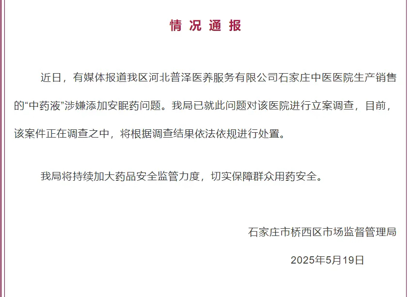 近日,有媒体报道我区河北普泽医养服务有限公司石家庄中医医院生产销售的“中药液”涉嫌添加安眠药问题。我局已就此问题对该医院进行立案调查,目前,该案件正在调查之中,将根据调查结果依法依规进行处置。