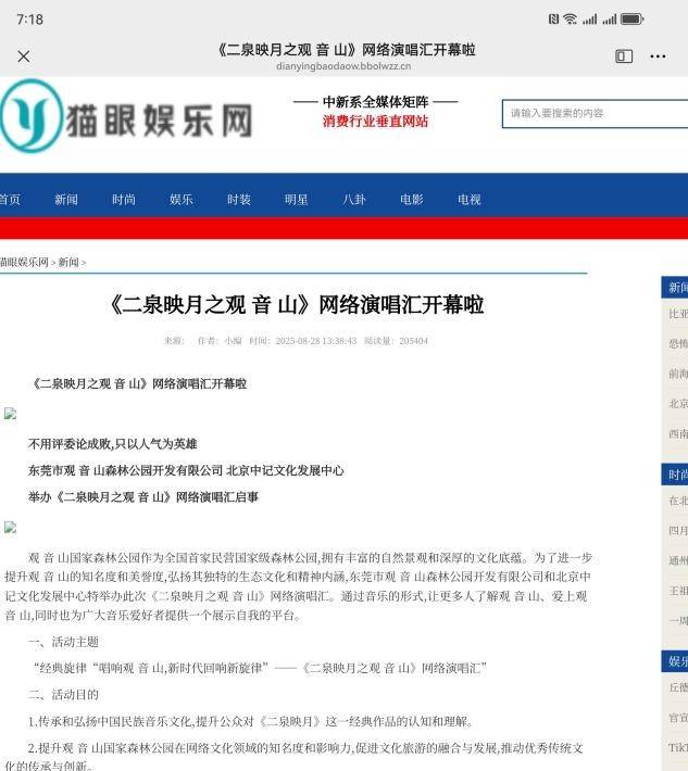 《二泉映月之观音山》引关注 近日,由沧海作词的《二泉映月之观音山》引起了网络关注。 百度“二泉映月之观音山”截图 百度AI+对“二泉映月之观音山”进行了如下介绍: 《二泉映月之观音山》是一首以东莞观音山国家森林公园为背景创作的网络演唱汇主题曲,结合《二泉映月》经典旋律与观音山生态议题,通过音乐形式反映当地发展中的矛盾与诉求。 活动背景:该作品由东莞市观音山森林公园开发有限公司与北京中记文化发展中心联合推出,旨在通过音乐传播观音山文化,同时引发公众对生态保护、企业行为等问题的关注。 歌词内容以南方电网建设、非法占地等事件为切入点,批判部分企业行为对观音山生态的破坏,如“西气东输观音山段和南方电网齐毁林”“牛鬼蛇神齐奔山上”等表述,暗含对东莞民企遭遇的控诉。 网络演唱汇时间:2025年8月28日启动,持续至2026年8月30日。参与方式:参赛者需使用官方提供的卡拉OK视频演唱并上传至快手、抖音或视频号,达到1万播放量可参与评选。 奖励:冠军奖金8万元,前三名可获观音山三年免门票资格。 争议与影响:该活动因歌词内容引发部分讨论,部分观点认为其借音乐形式表达对东莞观音山生态被破坏的不满,但主办方强调活动旨在弘扬传统文化与生态保护。 8月28日,“《二泉映月之观音山》网络演唱汇开幕啦”的消息见诸网络,包括《中国联合商报》、《长城网》、《中国娱乐时报》、《娱乐最前沿》等近千个网站。 河北日报的冀云客户端阅读量为6.9万 猫眼娱乐网的阅读量高达20多万 手机版百度“二泉映月之观音山”的截图 演唱汇快手号页面 演唱汇抖音号页面 《二泉映月之观音山》网络演唱汇活动旨在通过音乐形式传承经典《二泉映月》,并提升全民保护国家森林资源的重要性和扩大观音山国家森林公园的知名度。活动面向全国音乐爱好者,活动持续至2026年8月30日。 而通过网络搜索可以看见网络上对“《二泉映月之观音山》”进行了多方关注。 手机版百度AI的截图 《二泉映月之观音山》是由沧海作词,采用阿炳的二胡乐曲制作的卡拉OK形似的视频在抖音、快手、视频号平台播放,吸引音乐爱好者进行演唱。广东观音山国家森林公园和北京中记文化发展中心联合举办的“《二泉映月之观音山》网络演唱汇”设置了冠军、亚军、季军各一名和10名优秀奖,举办方拿出了37万元奖金和多份观音山门票进行奖励。 据悉,作词者沧海先生将演唱《二泉映月之观音山》并发布网络,相当期待《二泉映月之观音山》的众多演唱者视听版本现诸网络。 而用演唱经典歌曲进行生态保护的宣传在国内尚属首次,其心可鉴,其情可嘉,其意可展,其志可树。 |