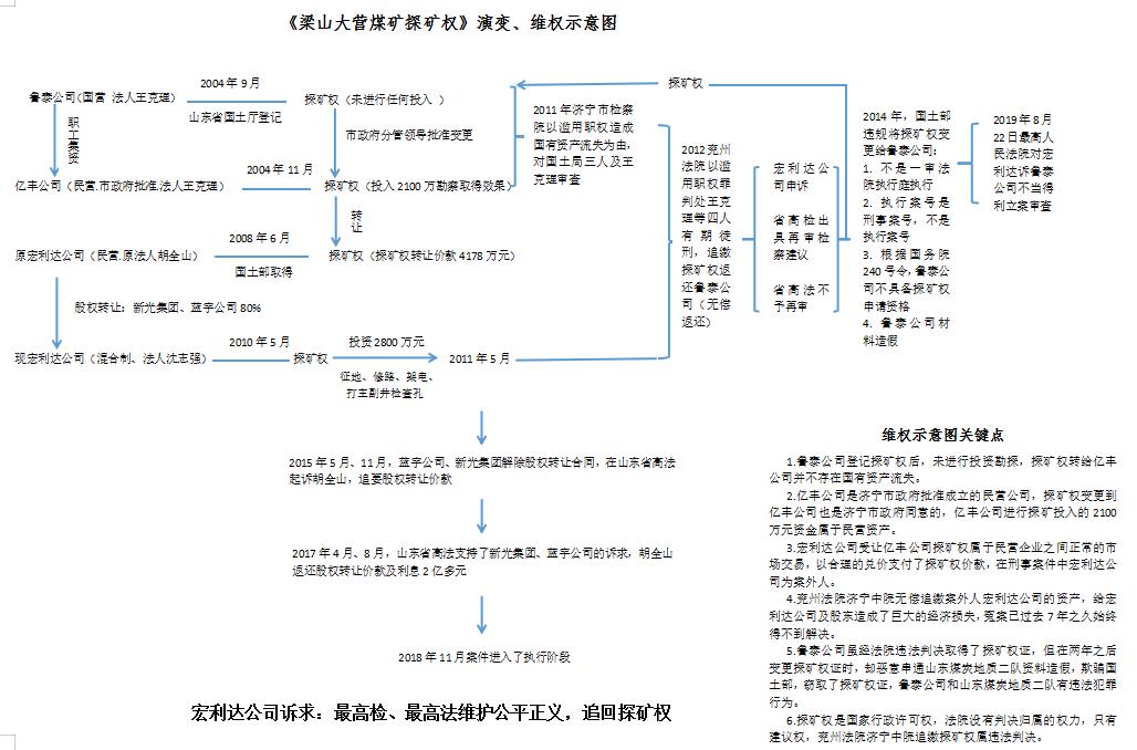 梁山大营煤炭探矿权2004年9月首次设立到现在已15个年头,15年来历经风雨,既有探矿权人成功的喜悦又有悲惨遭遇;本来能在梁山县大营地区发现新的煤炭资源,它不但给梁山县经济发展注入了新的动力,而且给国家增加了新的能源储备,是对社会的贡献,然而2004年12月因探矿权手续的变更,在时隔近7年后的2011年6月突然引起了悍然大波,将这一全部利用民营资金进行梁山大营探矿权勘查,所形成的民营资产,一夜之间当成国有资产被追缴,并将探矿权变更行为人判刑入狱,梁山大营探矿权遭冻结,煤矿建设停止,2000多名股民合法权益遭受侵犯,参与大营煤矿建设的相关企业遭受到巨大经济损失,判决裁定下达7年来从济宁中级法院、省法院、到高法从刑事申诉到民事诉讼从未间断。