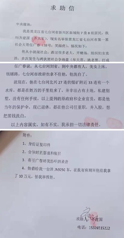 黑龙江省七台河市涉黑大哥任广春及其保护伞何时处理? 法讯网【fzkx.org】联动记者 纪奎权 黑龙江省七台河市有一黑社会“大哥”任广春,多年来通过各种非法手段攫取财富,并勾结政府干部做为保护伞,成为当地一霸,人称“笑面虎”。 该市新兴区新城街7委8组居民齐建国,曾在任广春手下多年,对其一系列恶行了如指掌,并且幡然悔悟,予以揭发。 齐建国说,任广春对当地的出租车、大型车辆等收取“保护费”,原市委秘书长(曾任运管处处长)宋国良及收费处处长李永发为其保护伞,只要提到任广春之名就放车。任广春还殴打多名执法交警,其中一名交警被打瞎一只眼睛,而李永发却出面摆平了此事。任广春在公安部门也有保护伞,如桃山区公安分局局长李盛录、原市公安局局长李伟东等。任广春曾送给李盛录一块黑色雷达表,送给李伟东两箱中华牌香烟和20万元现金。这两次行贿齐建国均在场。 任广春还组织妇女卖淫,被公安局周德威抓获后,交了1万元罚款了事,扣留的9个人全部释放。 齐建国还说,1997年,他与任广春合伙开煤矿,承包东风煤矿服务公司五井。这期间,任广春结识了原服务公司经理吴启山、原运销处储运处处长曲乃仁、原煤炭局局长徐大林,这些人都成了任广春的保护伞。任广春和齐建国的煤矿每出一吨煤要给曲乃仁提5元钱(当时每吨煤的售价为55元),逢年过节还要送上几万元的物品。在这些人的纵容下,任广春和齐建国每月往煤里掺几千吨岩石粉,严重地损害了国家的利益,而个人却攫取了不斐的财富。 任广春要盗采国矿的保安煤柱(用于保证不塌顶的煤柱),齐建国不同意,任广春就用恐吓、威胁的手段迫使齐建国退出而不退钱,说谁挡他财路就让谁死。齐建国退出后,任广春伙同吴启山、徐大林等人盗采保安煤柱,多次酿成矿难并且瞒报。2007年,任广春的昌隆煤矿发生瓦斯爆炸,死了17个人,该煤矿却一直生产至今。 齐建国说,他在前面提到的那些充当任广春违法犯罪保护伞的人现在均已退休,并在任广春的公司任职且有股份,借此将黑钱洗白。 任广春还叫嚣说,他在黑龙江省、七台河市和中央都有人,美女上床钱铺路,七台河市政府也拿不住他。 在中央全力打黑除恶的今天,任广春这样的黑社会人物还能在七台河大行其道,其背后的保护伞不可小视。七台河市委、市政府应该对任广春及其保护伞认真查处,严厉惩治,还人民群众一个温馨、祥和的生活环境。 |