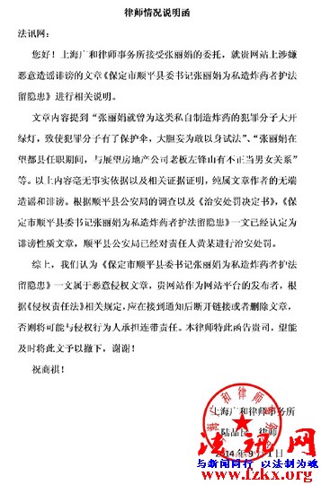 内容为针对张丽娟的恶意诽谤性文章,我们在此向贵网站进行说明(详见附件《说明函》),望贵网站及时将