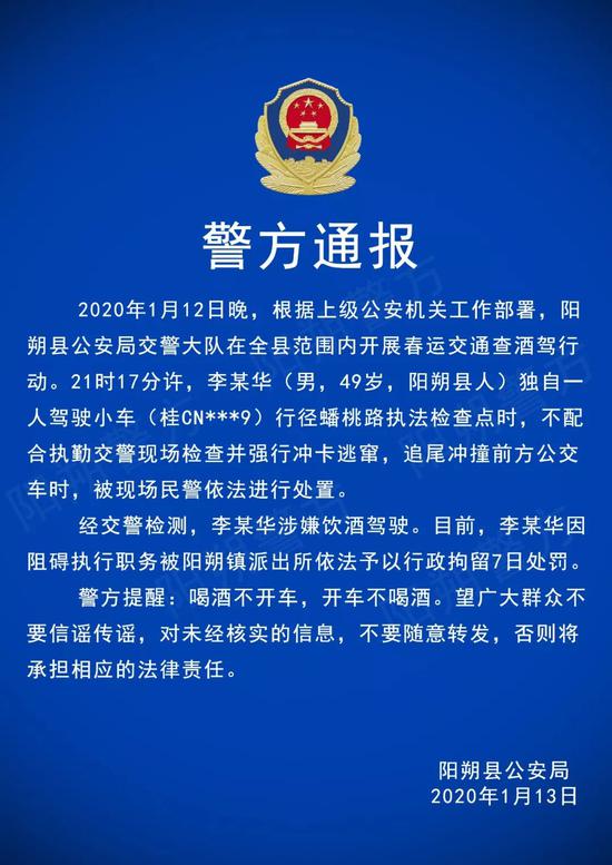 今天(1月13日),桂林人朋友圈流传的在阳朔西街口的天桥旁警方破窗的视频,真相是这样的。。。 ![]() ![]() 今天(1月13日),桂林人朋友圈流传着一个在阳朔西街口的天桥旁警方破窗的视频。视频中,多名警察一起在拦截一辆黑色的小车,小车撞上前方的客车被迫停下,但是司机一直没有开窗,几位民警合力砸窗,终于把司机押下车。 今天晚上8点35分,阳朔县公安局发布了官方通报: ![]() ![]() 昨天(1月12日)晚上,阳朔县公安局交警大队在全县范围内开展春运交通查酒驾行动。 ![]() 21时17分许,李某华(男,49岁,阳朔县人)独自一人驾驶小车(桂CN***9)行径蟠桃路执法检查点时,不配合执勤交警现场检查并强行冲卡逃窜,追尾冲撞前方公交车时,被现场民警依法进行处置。 ![]() ![]() 目前,李某华因阻碍执行职务被阳朔镇派出所依法予以行政拘留7日处罚。 开车不喝酒 喝酒不开车! 扩散!提醒更多人! 资料来源:平安阳朔