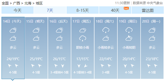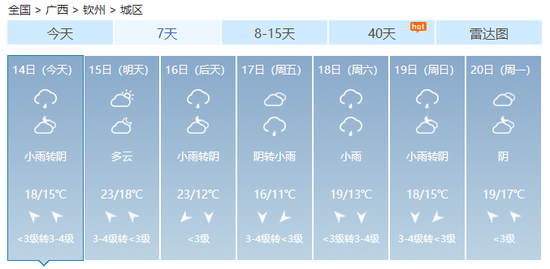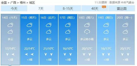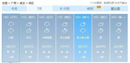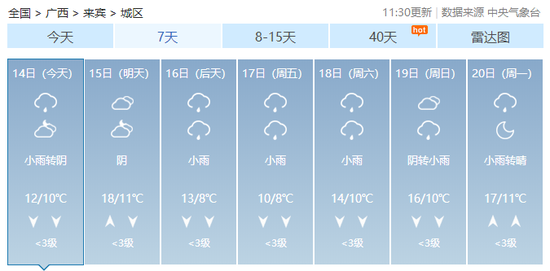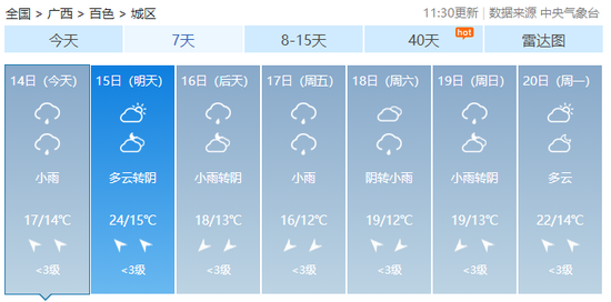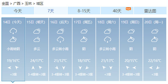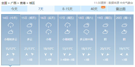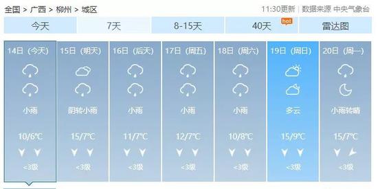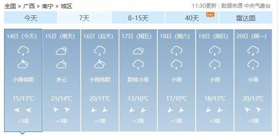 明天(1月15日)白天,桂林、柳州、河池、来宾等市及南宁市的北部阴天大部有小雨,局部中雨,我区其它地区多云到阴天局部有小雨。16日,桂北部分地区有中雨,局部大雨,我区其它地区阴天大部有小雨。17日,桂北、桂中阴天有小雨,我区其它地区阴天。
