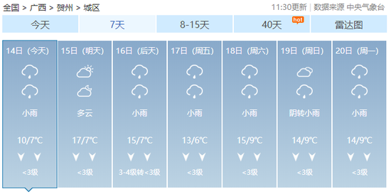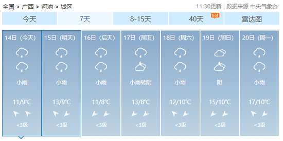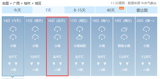 15时,大部地区气温5~16℃其中气温最低的桂林资源只有5℃。预计今天晚上,桂林、柳州、河池、贺州、来宾、贵港、南宁、崇左、防城港等市阴天大部有小雨,局部中雨,我区其它地区阴天到多云、局部有小雨。