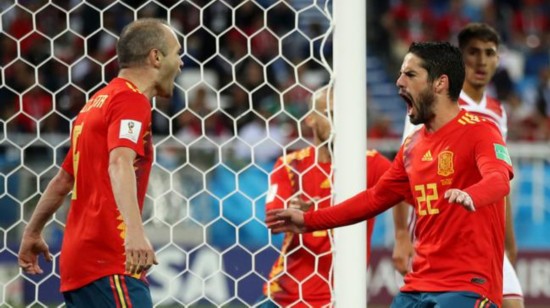西班牙将战摩洛哥 北京时间6月26日02:00(加里宁格勒当地时间25日21:00),2018年世界杯B组末轮一场比赛在加里宁格勒球场展开角逐,西班牙2比2险平摩洛哥,布塔伊布先拔头筹,伊斯科扳平,西班牙门框救险,替补出场的恩内斯里第81分钟进球,同样替补出场的阿斯帕斯第91分钟再次扳平。西班牙因进球多优势力压葡萄牙获得小组头名,1/8决赛将战俄罗斯。 西班牙在1961年世界杯预选赛附加赛中双杀摩洛哥。西班牙近22场比赛保持不败,本场比赛保持不败将确保小组出线,蒂亚戈轮换卢卡斯出场。摩洛哥近15场世界杯赛事仅胜2场,但2场比赛均在小组赛末轮取胜,赛斯轮换贝纳蒂亚出场。 提前出局的摩洛哥并未消极放弃比赛。N-阿姆拉巴特对拉莫斯犯规险些引发冲突。随后卡瓦哈尔回传失误,皮克双腿飞铲布塔伊布又引来摩洛哥球员的激烈抗议。摩洛哥第14分钟取得领先,拉莫斯和伊涅斯塔后场让球失误,布塔伊布单刀突入禁区内14码处推射,皮球从德赫亚双腿间穿过入网。这是摩洛哥自1998年以来的首粒世界杯进球。