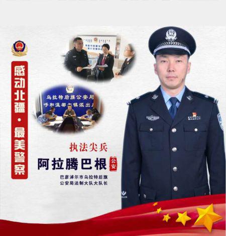 阿拉腾巴根,乌拉特后旗公安局法制大队大队长,从警17年来,一直战斗在公安工作的第一线,多次荣获先进工作者和优秀共产党员。创新推出“以案代训”法制大轮训培训模式,先后参与办理两起公安部督办案和全市首例恶势力犯罪集团案,经他审核的案件,无一引起复议、诉讼、赔偿,被称为“执法尖兵”。(完)