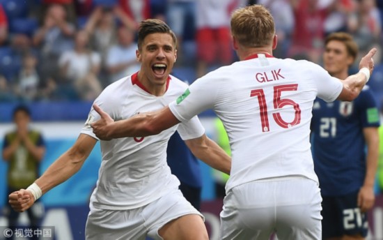 日本0-1波兰 H组末轮,日本队在伏尔加格勒竞技场0比1负于波兰,比赛结束之后,日本和塞内加尔同为1胜1平1负积4分,且均为进4球失4球净胜球为0,根据规则两队比拼黄牌数,日本因为得牌数较少幸运获得小组第二,和哥伦比亚携手晋级16强。 本场比赛日本队轮换了多达6名主力队员,香川真司、长谷部诚等绝对主力都被西野朗安排在了替补席上,最终西野朗排出的是一套442的首发,冈崎慎司和武藤嘉纪搭档锋线,酒井高德和宇佐美贵史在两翼活动,山口萤和柴崎岳双后腰。后卫线上,吉田麻也和槙野智章搭档中卫,长友佑都和酒井宏树一左一右,门将还是川岛永嗣。波兰方面也是派上多名替补,但还是由莱万多夫斯基领衔出战。 上半场双方最好的一次机会来自于波兰队,第32分钟,贝雷琴斯基右路传中,格罗西基的头球攻门被川岛永嗣在门线上神勇扑出,半个皮球越过了门线但并未整体过线,日本队逃过一劫。 然而下半场波兰队还是敲开了日本队的大门,第一次险情出现在第53分钟,格罗西基右路送出妙传,莱万多夫斯基几乎获得单刀机会,川岛永嗣及时出击化解险情。而第59分钟,库尔扎瓦任意球传中,贝德纳雷克凌空垫射命中,波兰终于完成破门,1比0领先日本。
