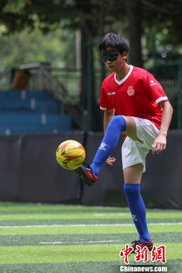 盲人足球队员王世海在练习运球。贺俊怡 摄 盲人足球比赛采取5人赛制,选手是经医学鉴定属于视力残疾的盲人,除守门员外他们上场需要佩戴眼罩。足球使用的是特制的盲人足球,里面藏有响铃。球员在场上通过足球滚动发声及教练声音的指引来辨别足球与自身所处的位置。 2018年4月,贵州特教中职校成立了贵阳市首支盲人足球队,球队由10个盲人学生组成,最大的38岁,最小的18岁,每周一至周五的下午4点至6点,是足球队员的固定训练时间。